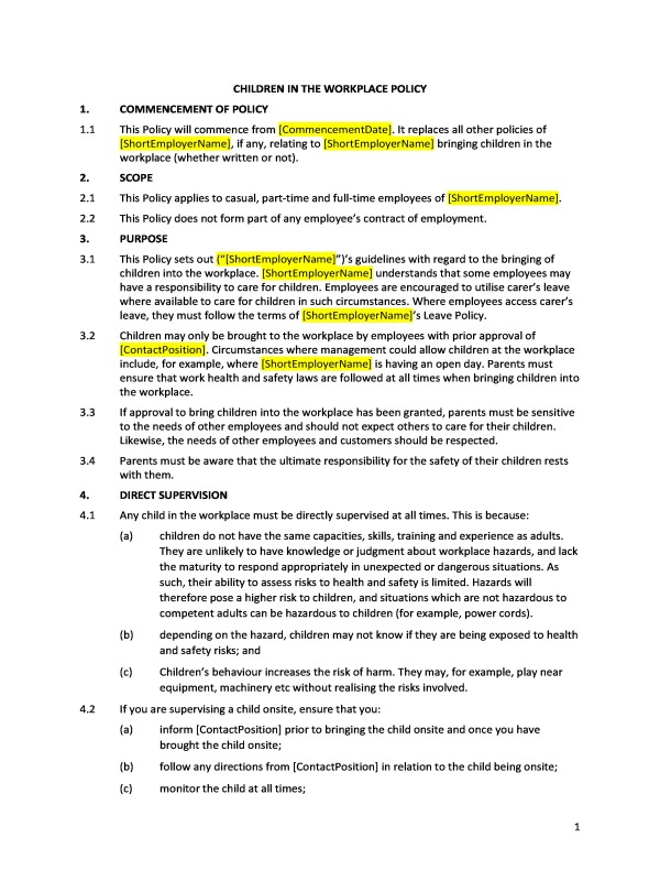 This document will assist employers in creating a policy about the presence of children in the workplace. The policy covers the bringing of employees' children into the workplace, but not the employment of children.