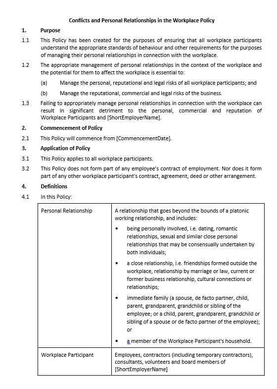 This policy assists employers and agents, contractors (including temporary contractors), consultants, volunteers and board members (referred to as ‘workplace participants’) to understand the appropriate standards of behaviour when managing their “personal relationships” in the workplace.