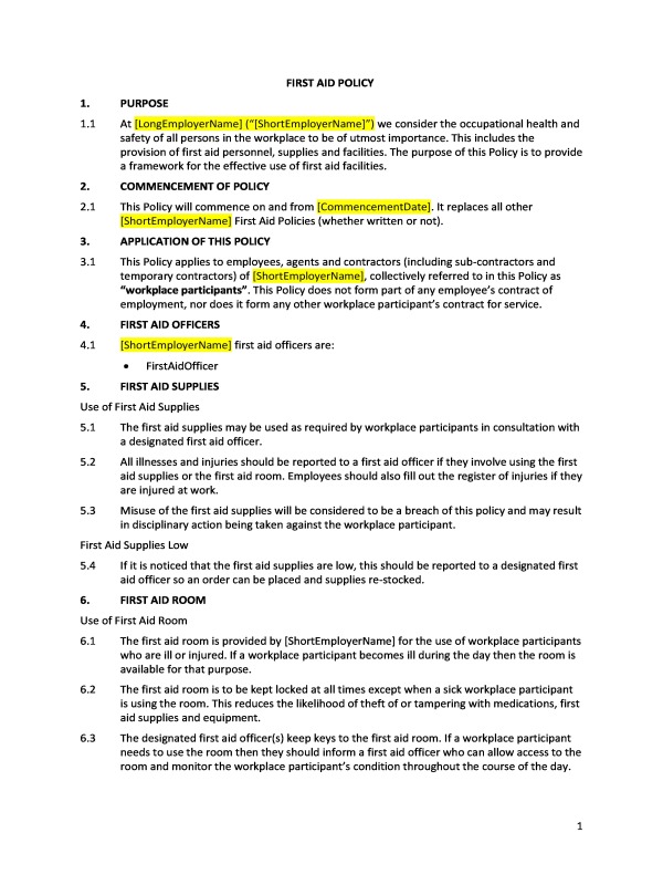 This is a general First Aid Policy which sets out the broad obligations of employers and employees, agents, volunteers, work experience students and contractors, including sub-contractors and temporary contractors (referred to as 'workplace participants') under the relevant workplace health and safety legislation (the 'Legislation'). Employers have a responsibility under the Legislation to make provision for first aid facilities and personnel.