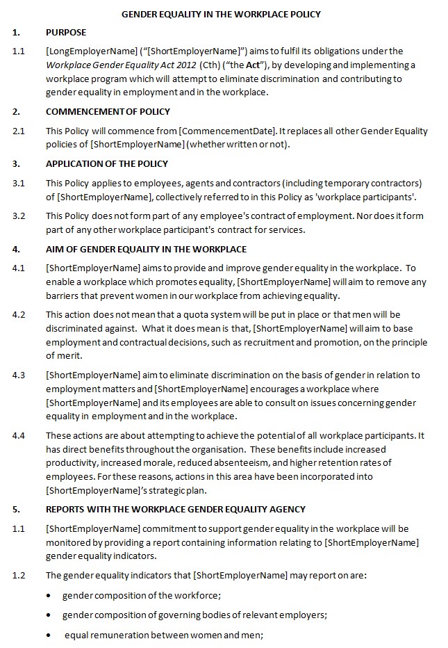 These principles are embodied in the Gender Equality in the Workplace Policy (Policy). The Policy also notifies employees, agents and contractors (including temporarycontractors) that the employer may report on gender equality indicators to the appropriate government agency.