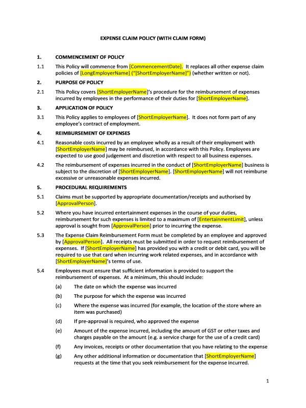 This Policy also includes an Expense Reimbursement Claim Form which can be provided to an employee to complete in order to seek reimbursement.