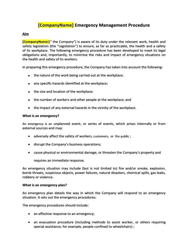 Compliance with this Emergency Management Procedure will assist the company in meeting its obligations under the Legislation, associated regulations and codes of practice.
