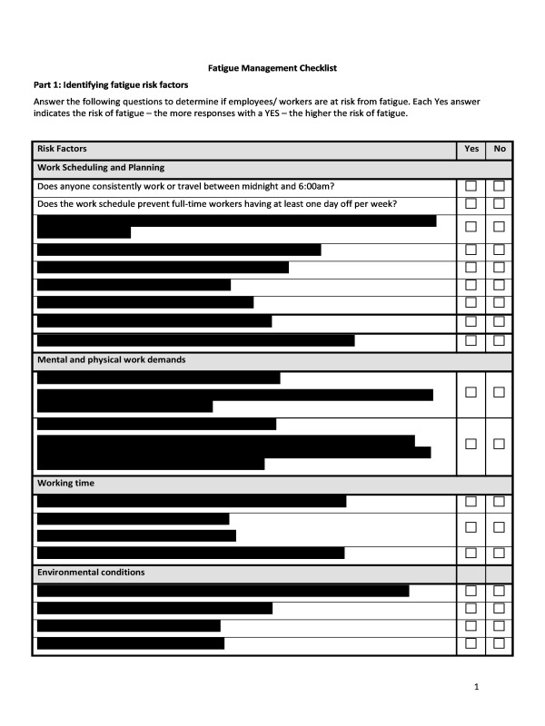 This checklist sets out factors [without limitation] to consider as part of the risk management process for identifying risks associated with fatigue such as shiftwork operations, driving long distances, and issues/flaws with current fatigue management processes within the business. This checklist will assist businesses to meet their work, health and safety obligations regarding fatigue management and will assist with helping to ensure that any potential risks are eliminated, or minimised, as far as reasonably practicable, so that work is able to be performed in a safe manner.