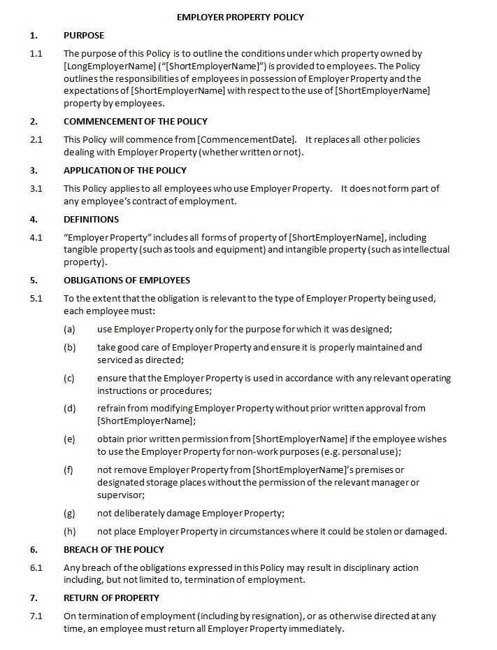 This policy sets out the responsibilities of workplace participants who have been given access to, or use of, property belonging to the employer. In summary, the Policy requires workplace participants to exercise care over the property and to return property on termination or at any other time as directed by the employer.