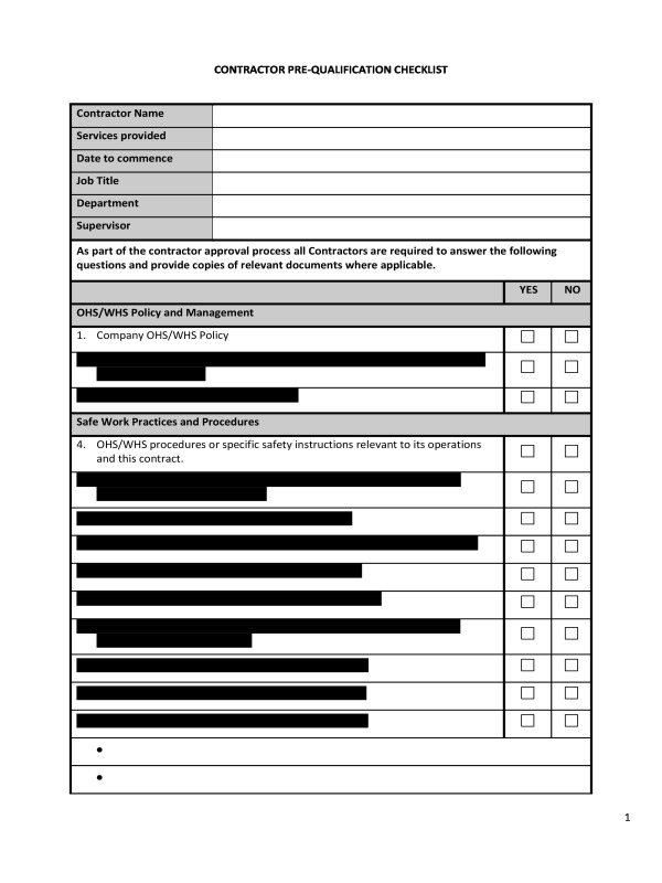 Businesses should use this checklist prior to engaging contractors to assist in assessing and evaluating contractors against specific contract requirements before work commences. This checklist can also assist with establishing a list of preferred and authorised contractors to perform work for your company.