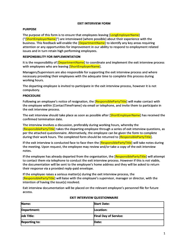 This form includes an exit interview questionnaire to be completed by the exiting employee or to be used as a guide for face to face exit interviews by the person/department responsible for conducting the exit interview.