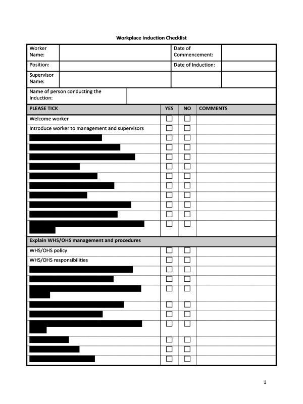 A Workplace Induction Checklist can be used for new employees and contractors prior to the commencement of work. You can tailor this checklist to suit your own workplace.