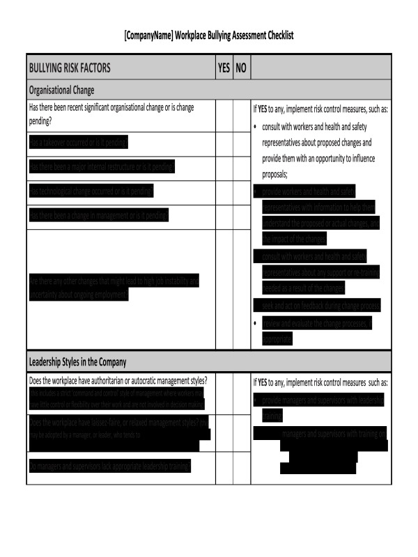 This checklist has been developed to assist employers in their duty to identify, assess, eliminate and/ or control bullying in the workplace, taking into account the common risk factors.