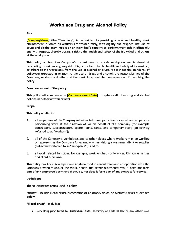 The commentary which follows is not legal advice, rather it is a general guide to understand the drug and alcohol policy. If you are unsure about any aspect, you should seek advice from a workplace lawyer.