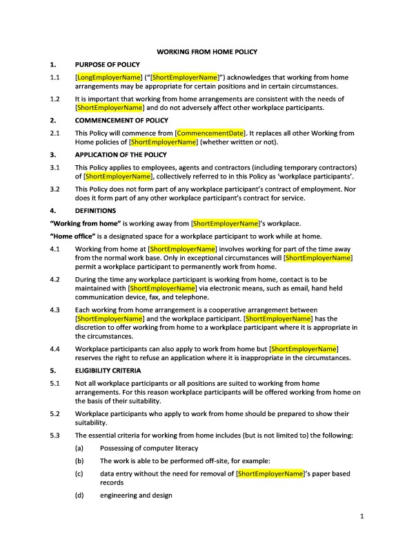This policy includes provisions dealing with: eligibility criteria; particular conditions that may apply; work health and safety issues; and the home office location.