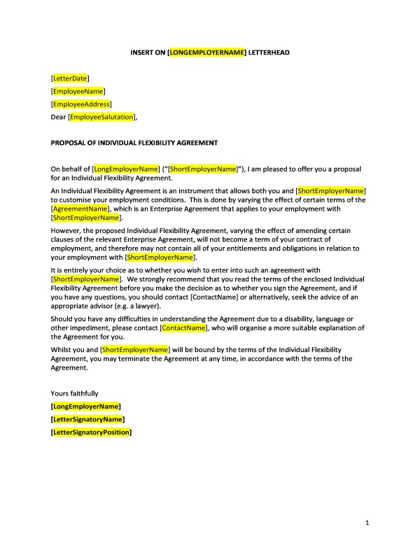 The Flexibility Agreement, which is essentially an extension of the relevant Enterprise Agreement, does not regulate all the terms and conditions of employment of the employee subject to the agreement. It is recommended that all employees are still provided with a letter of offer or contract of employment, which will operate alongside the Enterprise Agreement and the Flexibility Agreement.