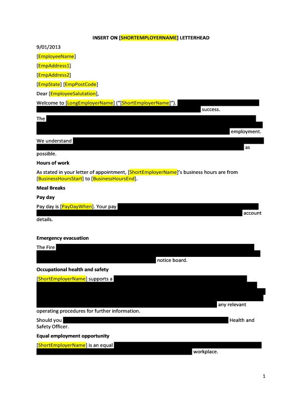 This letter is designed to be included in induction materials and given to the employee on the first day of employment, or earlier if possible.