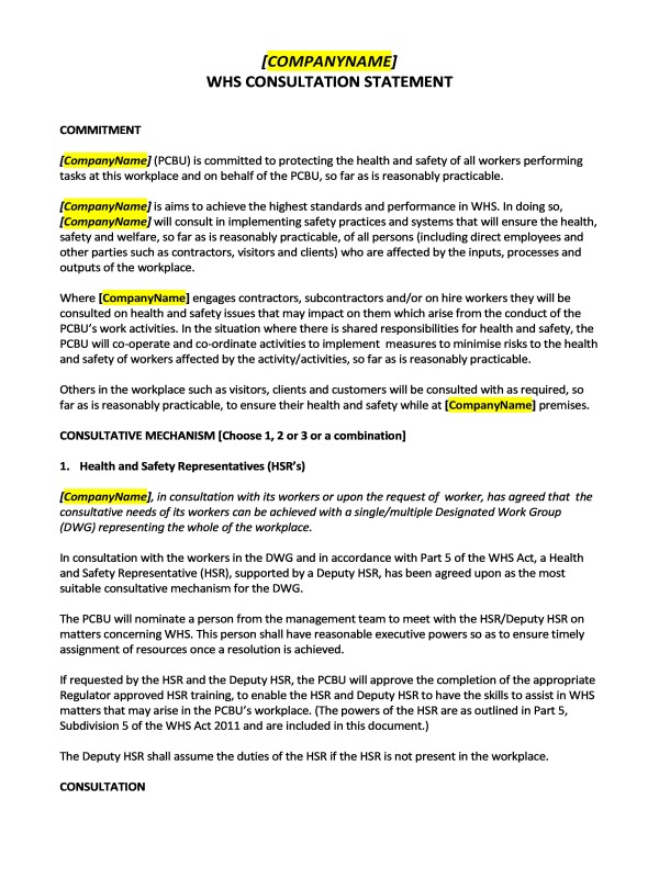 Preparing a WHS Consultation Statement allows an employer to record their consultation arrangements.