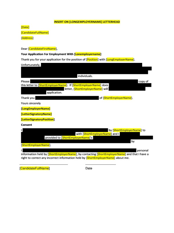 The letter contains a section that asks for the applicant's consent to retain the documents. This may be useful where the applicant was unsuccessful for the role being advertised, but may be suited to positions which could arise in the future. While the attached letter will meet the employer's general privacy obligations under the Act, specific legal advice should be sought in relation to privacy issues which may arise in relation to particular applicants from time to time.