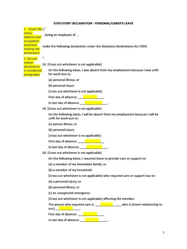 In appropriate circumstances, the Statutory Declaration — Personal/Carer’s Leave can be completed by employees if they need to provide a statutory declaration in support of the particular absence.