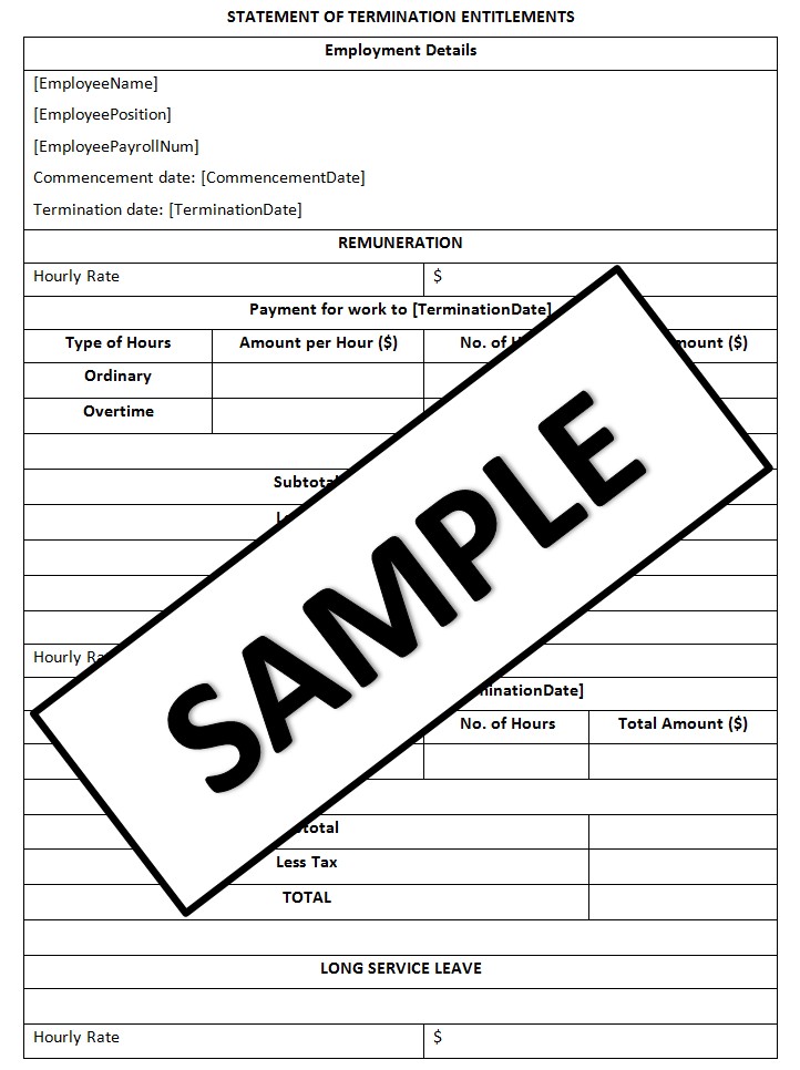This statement will not be suitable in all circumstances. What is provided here is a sample document. There may be payments for amounts (for example annual leave loading, redundancy payments and bonuses) in the statement that may not be applicable to the employee. Accordingly, it will be important for you to remove any reference in this statement to payments that do not apply to the employee whose employment has terminated (for whatever reason). If you are unsure you should seek legal advice.