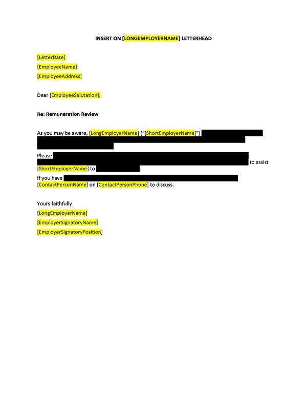 In addition, the letter also provides Workplace users with the ability to indicate when the employee's remuneration will next be reviewed, as well as provide the ability to insert additional reasons as to why the employee's remuneration will stay the same.