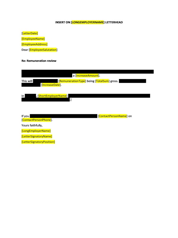 When your business increases an employee's remuneration, you should inform the employee about the increase. This letter can be used for this purpose.