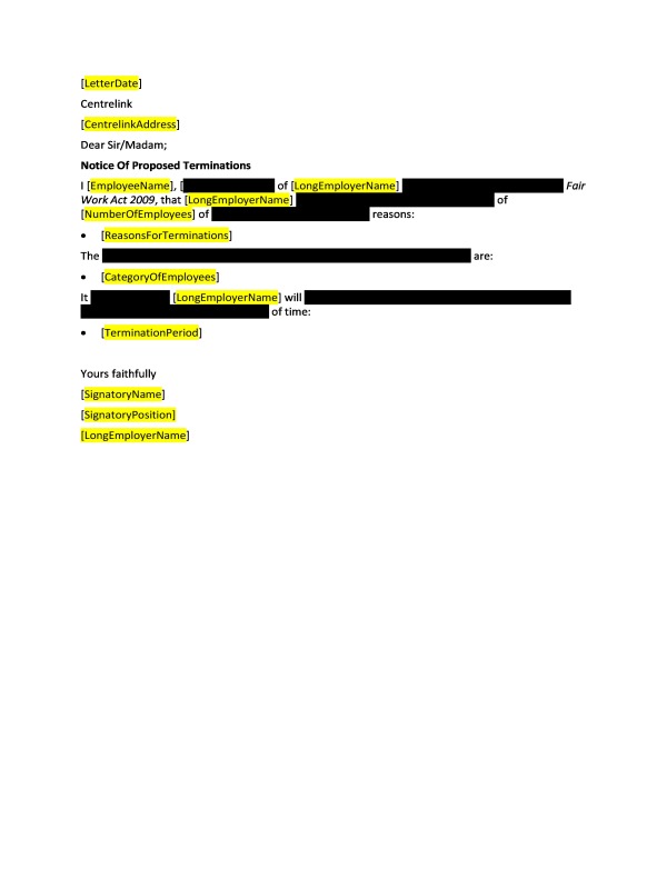 Under the Fair Work Act 2009 (Cth) (the 'Act'), all employers who terminate employment due to redundancy will need to notify Centrelink in writing if: