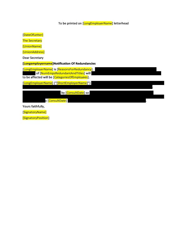 This letter will assist you to comply with the obligations under the Act. Prior to finalising the letter you should check it complies with the relevant obligations in an award, agreement contract of employment or redundancy policy.