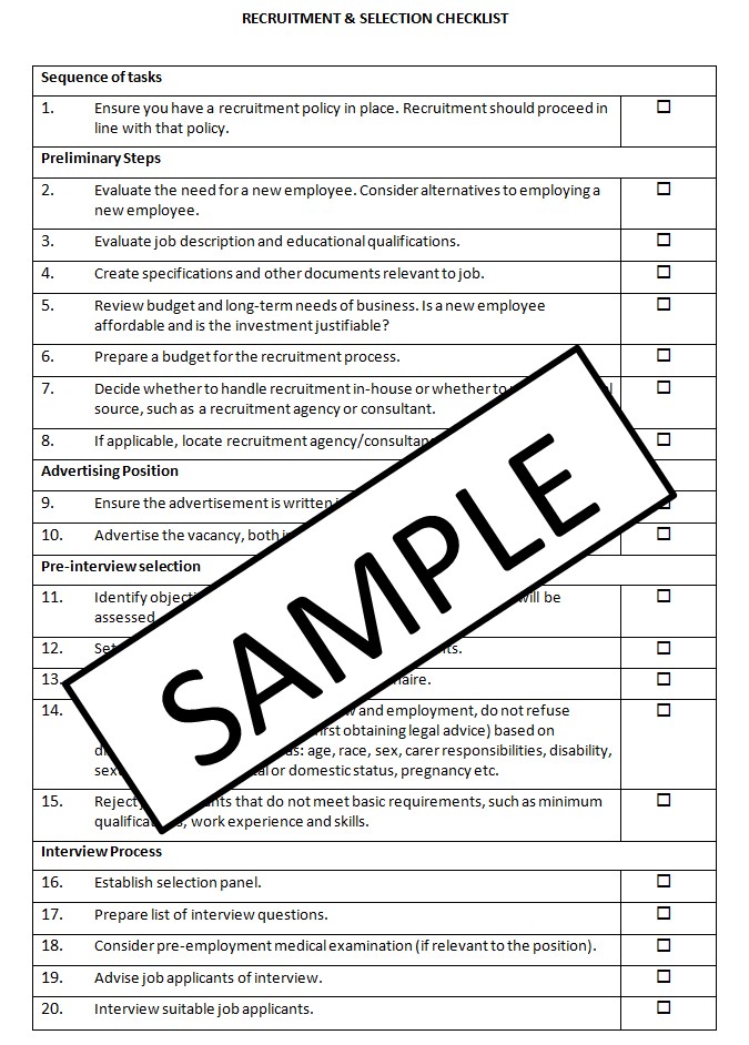 This convenient checklist or set of prompts is designed as a 'warning list' applicable at each stage of the recruitment process. When a possible problem is detected there should be further investigation to make sure that a compliance breach does not occur.