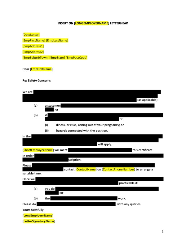 If the medical certificate provided by the employee identifies that, in the medical practitioner’s opinion, the employee is fit to work but it is inadvisable for the employee to continue in her present position for a stated period because of illness or risks arising out of the pregnancy or hazards connected with that position, the employer should obtain advice regarding its obligations, including those relating to providing the employee with a ‘safe job’, 'no safe job leave' or unpaid parental leave.