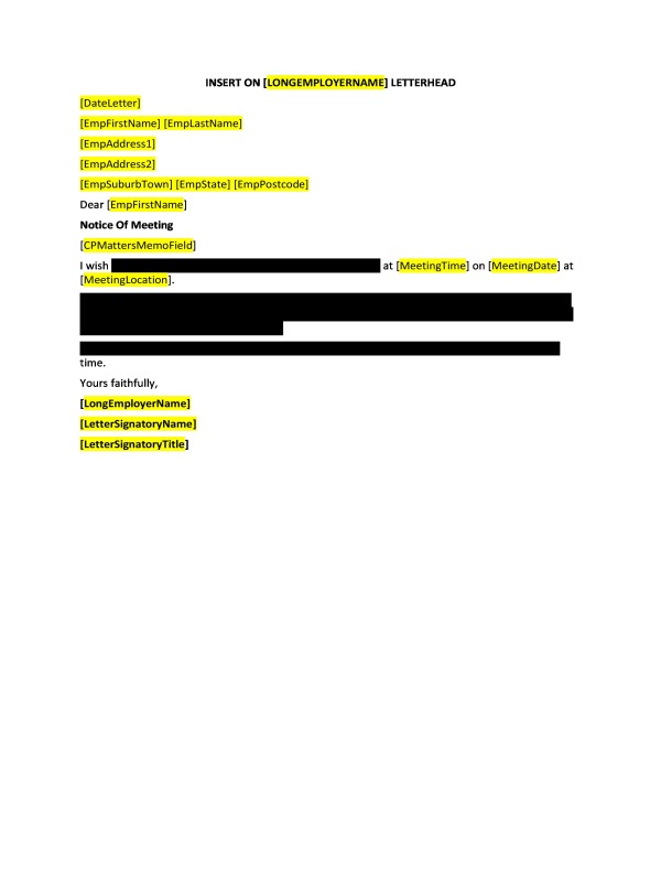 This document should be given to an employee as far in advance of any meeting as possible. Failure to provide an employee with appropriate notification of a meeting may have adverse consequences for an employer where the meeting leads to termination of employment (e.g. a finding that the termination was procedurally unfair).