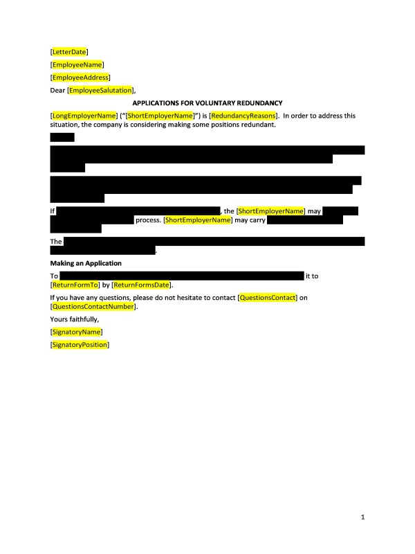 This letter seeks expressions of interest for voluntary redundancy. However, the letter also reserves the employer’s right to reject particular volunteers, based on the operational requirements of the business. In particular situations an employer may have broader or lesser discretion — this letter is simply put forward as a possible approach.