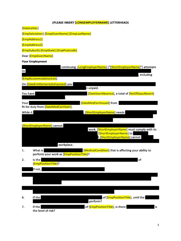 The letter commences with a reference to previous meetings with, or correspondence to, the employee about the employee's absences from the workplace due to illness or injury. You will be able to insert information which is relevant to the employee into the letter.