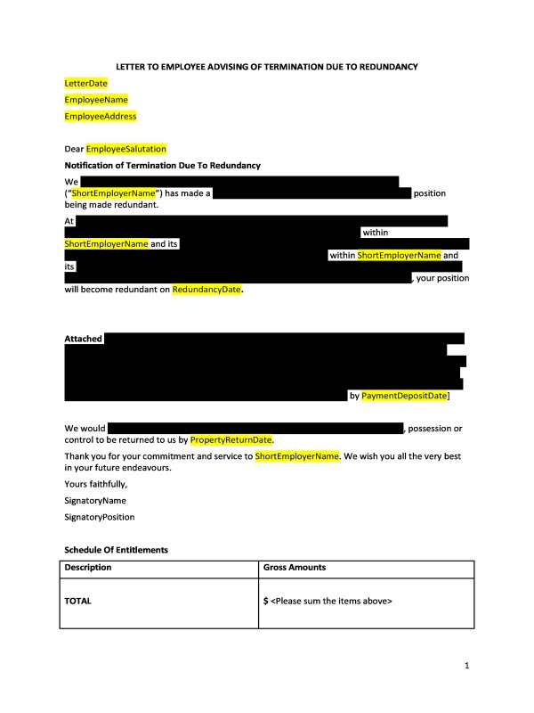 Important: The template letter we have provided has an optional 'Schedule of Entitlements' section which you can complete and include in the letter. It is very important that you check the monetary entitlements you record in the schedule are correct, before providing the letter to the relevant employee(s). If you have over-calculated the entitlements owed and present this to the employee(s), you may in some circumstances be bound to pay the additional amounts you have offered, despite the fact a miscalculation has occurred.