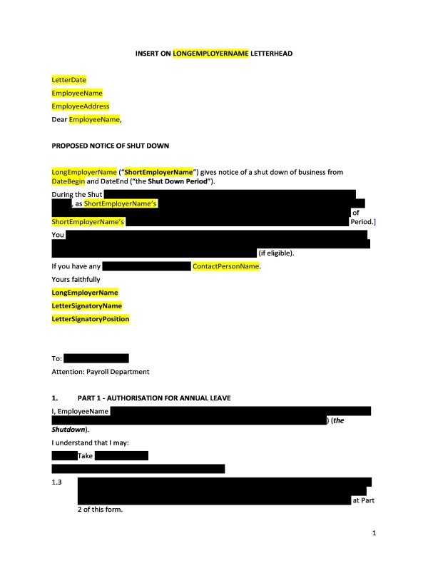Federal workplace law allows non-excluded employers to direct their employees to take accrued annual leave if the business (or part of the business) shuts down for a period, for example over the Christmas–New Year period, and the request is reasonable. This letter assists employers with how to inform their employees of a shut down period. If an employer has multiple shut downs during a year then they should seek advice as to whether they can require employees to take leave during each shut down period.