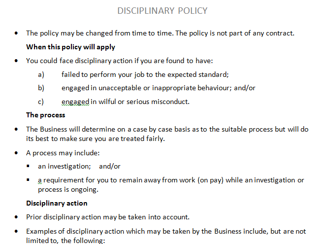 Many businesses sometimes adopt unnecessarily rigid or detailed disciplinary policies that are impractical to comply with on all occasions. This can expose the business to risk because, if the disciplinary process is not followed, claims for unfair dismissal or breach of contractual or other duties can arise.