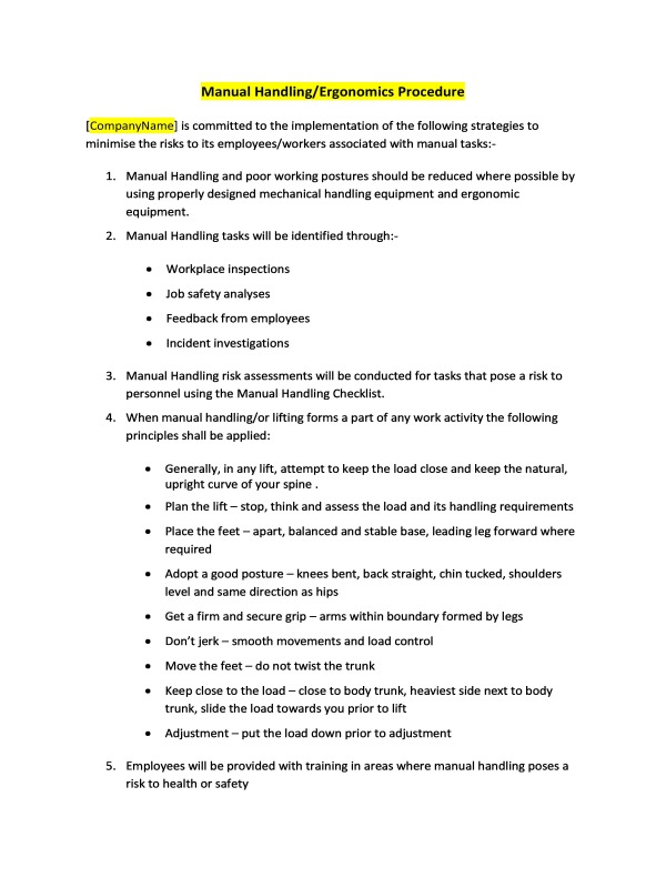 This procedure outlines the steps involved in the management of manual handling and ergonomic risks in the workplace.