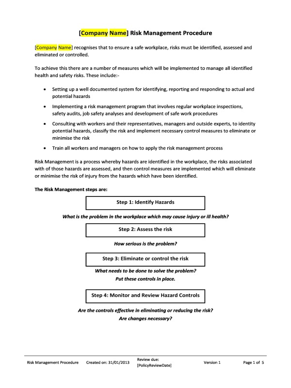 A Risk Management Procedure provides a guide for employers to manage health and safety risks which may arise in the workplace. To ensure employers identify, assess and eliminate risks in their workplace, this Procedure provides an outline of the measures which may be implemented to identify such risks and the steps to take throughout the risk management procedure.