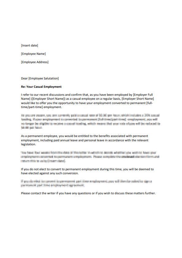 This letter is designed for employer’s whose new and existing employees are covered by a modern award. Majority of modern awards now require the employer to provide their employees with a copy of any casual conversion clause contained in the award: