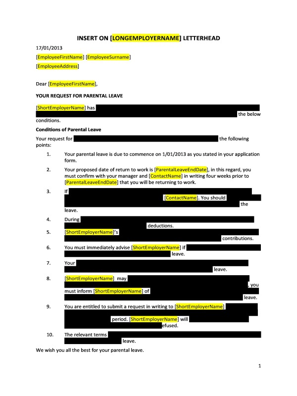 We recommend that you have a Parental Leave Policy in place to accompany the acknowledgement of terms of parental leave letter.