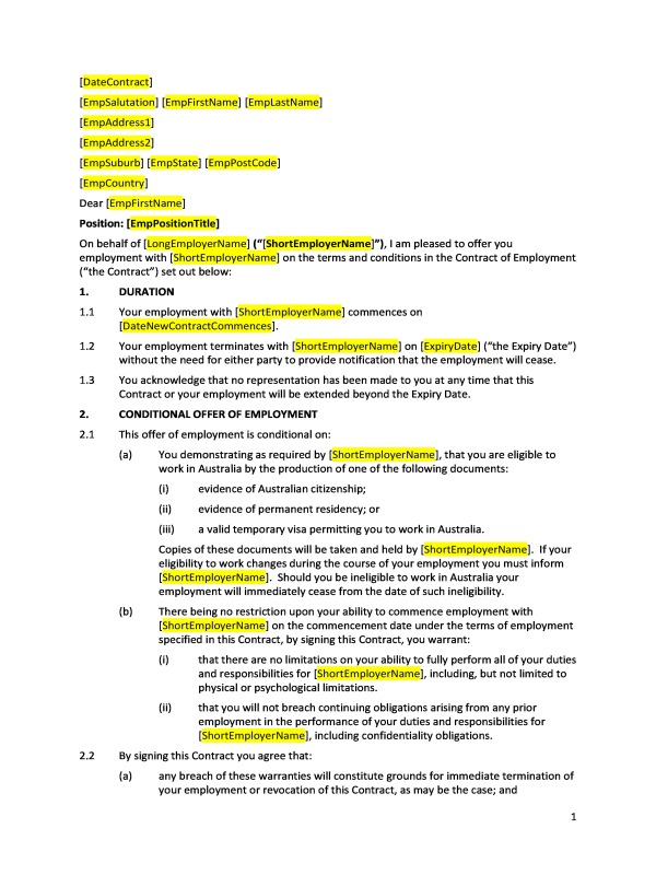 This document will assist you in creating a written contract of employment for a specified period of time (otherwise known as a 'fixed term contract'). You will be able to tailor the contract to suit your requirements and circumstances. The contract will typically end without either party needing to give notice to terminate since the contract will conclude through the passage of time, not at the initiative of either the employer or employee.