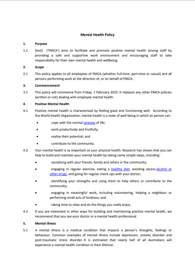 The policy aims to encourage employees to report mental health issues to the employer. This means that an organisation that wishes to adopt the policy will need to ensure that it has appropriate processes in place for receiving and managing reports about mental health issues. The policy has been drafted to avoid imposing specific obligations on the employer in this regard.