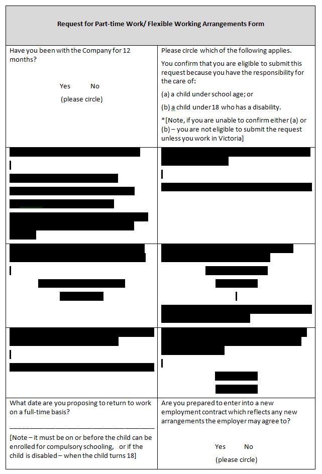 The commentary that follows is not intended to be comprehensive and does not address all legal issues that should be considered and addressed in dealing with requests for flexible working arrangements. Employers in Victoria are also subject to additional obligations (see below).